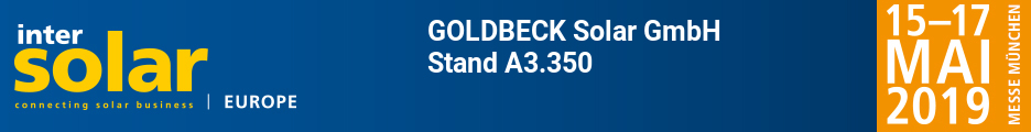 Liebe Kunden und Geschäftspartner. Wir laden Sie herzlich ein, uns an unserem Stand A.350 auf der Intersolar Europe 2019 zu besuchen, welche vom 15. Mai bis Freitag, 17. Mai, auf dem Messegelände München stattfindet. Bei diesem Event werden wir unser erstes installiertes Giga Watt Solar feiern. Dies ist ein wichtiger Schritt bei der Etablierung von Goldbeck Solar auf internationaler Ebene.